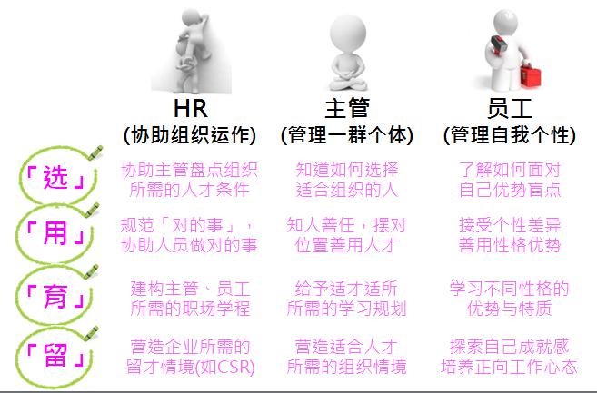 透過科學(xué)客觀的評估,在職員工的性格特質(zhì),使之能適才適所;當(dāng)每一個人做完評量之后,組織性格匯整分析可以依課別、部別、項目別做彈性調(diào)整;歸納和解析組織性格傾向;依此建立各部門的職能模型,并獲得“個體性格”與“職能性格”的專業(yè)建議,以便用于擬進職員工,選擇適合職場性格的人才。